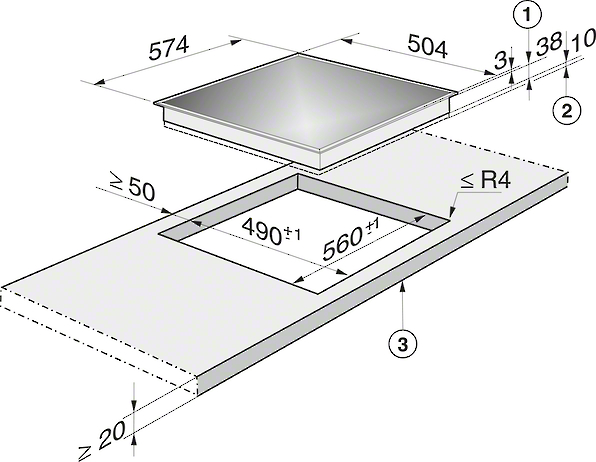 | Dimenzije izreza u mm (dubina) kod ugradnje polaganjem na radnu površinu |